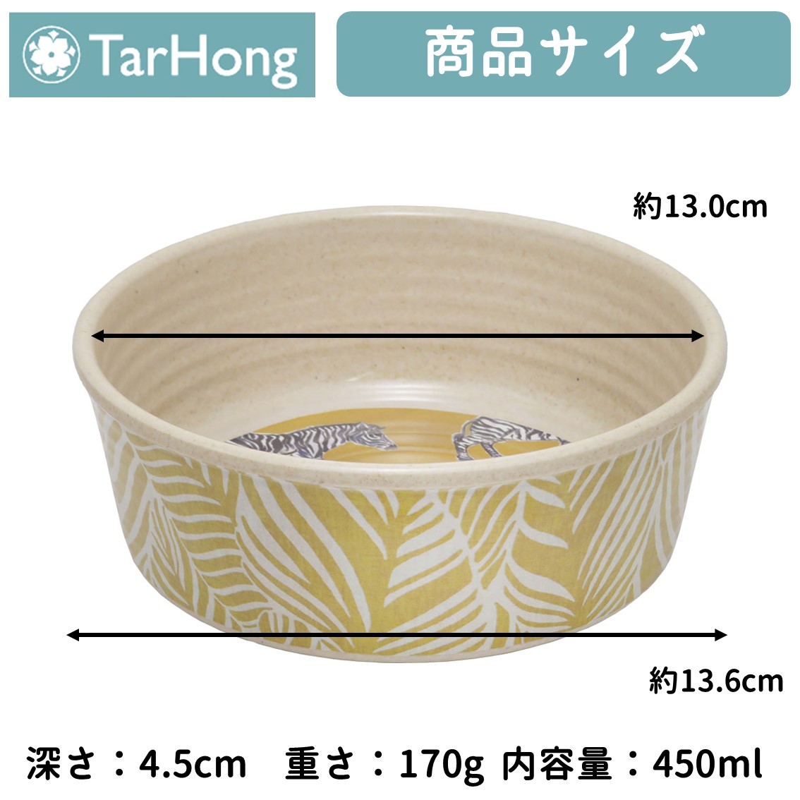 | 商品説明 | TarHong オーガスタボウルは、自然を感じる植物の柄と動物のイラストがオシャレで可愛い、丈夫なメラミン樹脂製のフードボウルです。 底面には滑り止めが付いており、食事中のカタカタ音を防ぎます。 また、ボウルは食洗器対応の為、お手入れがしやすく清潔に保てるのも嬉しいポイントですね♪ ※電子レンジ不可 |