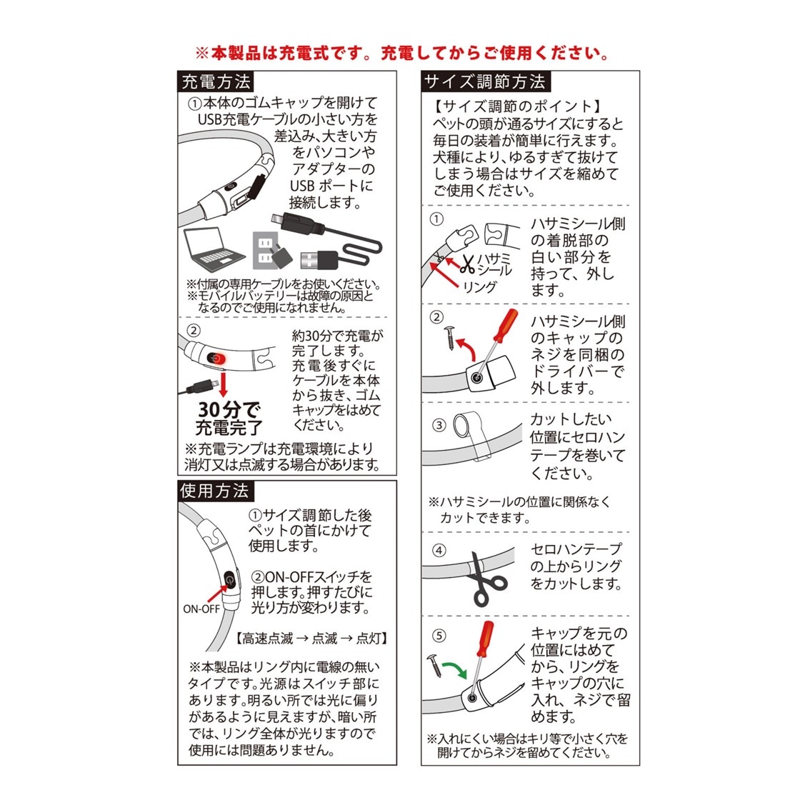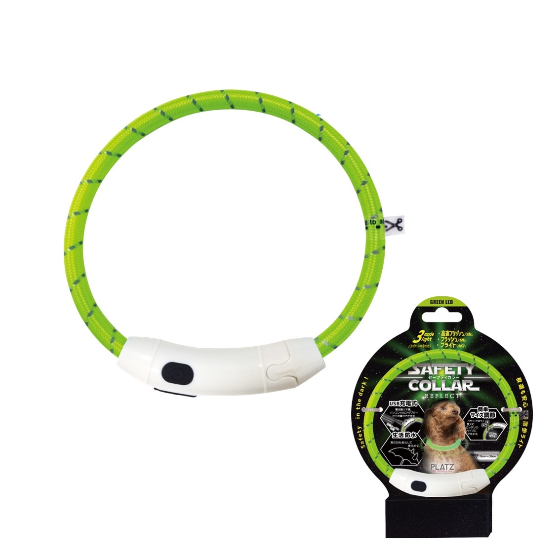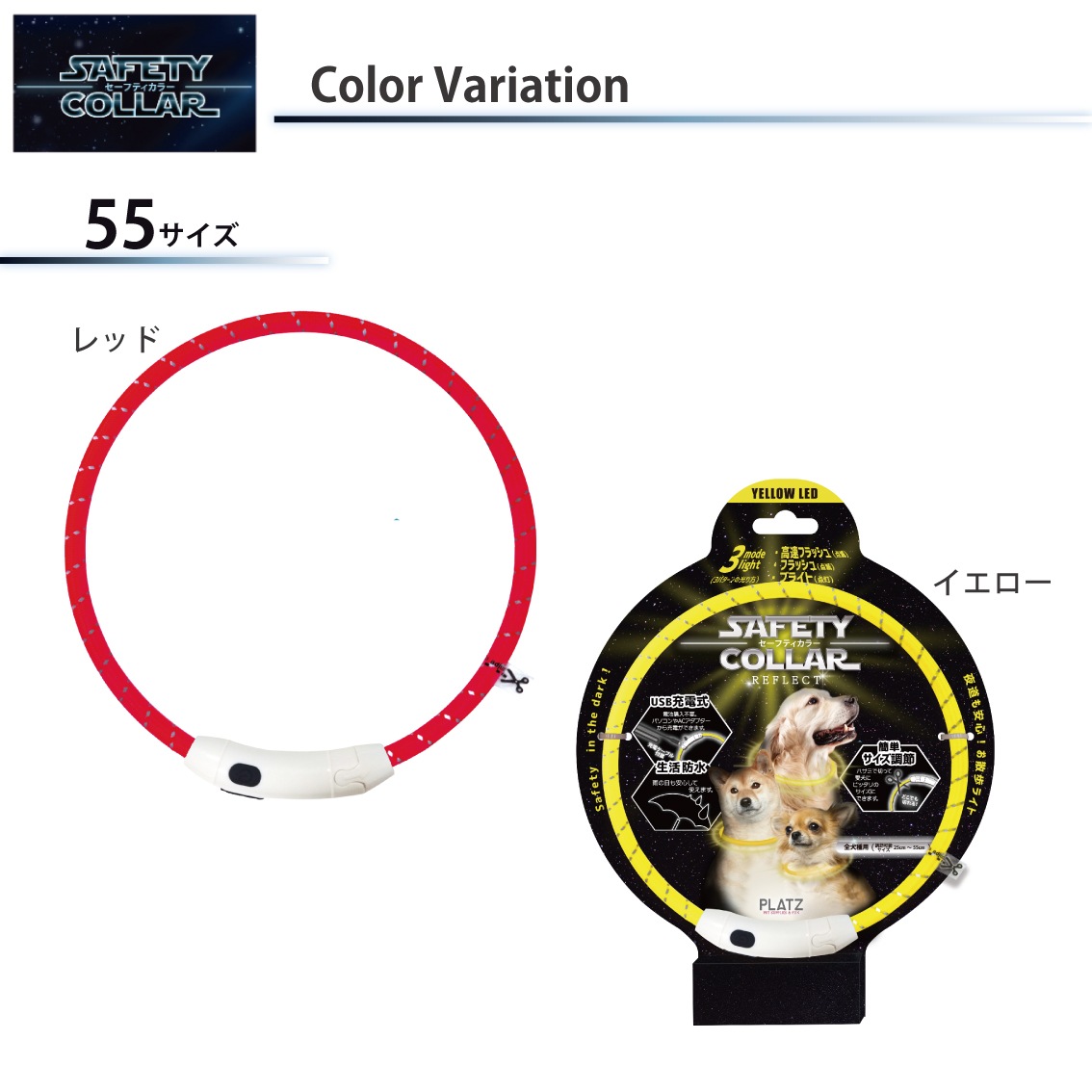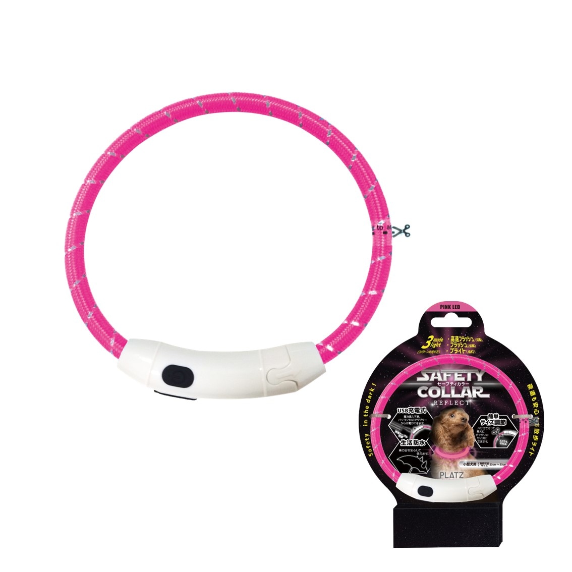 首輪全体が光る、大人気のお散歩用ライトがリニューアル! リング部分には反射ステッチが施され、より安全にお散歩が楽しめるようになりました。 新色も登場し、カラー展開もさらに豊富に。 パッケージも新しく生まれ変わりました。 USB充電式で、パソコンやACアダプターから充電ができサイズ調節も簡単です。 高速フラッシュ(点滅)・フラッシュ(点滅)・ブライド(点灯)の3モードの光り方、スイッチひとつで選択可能です。 |