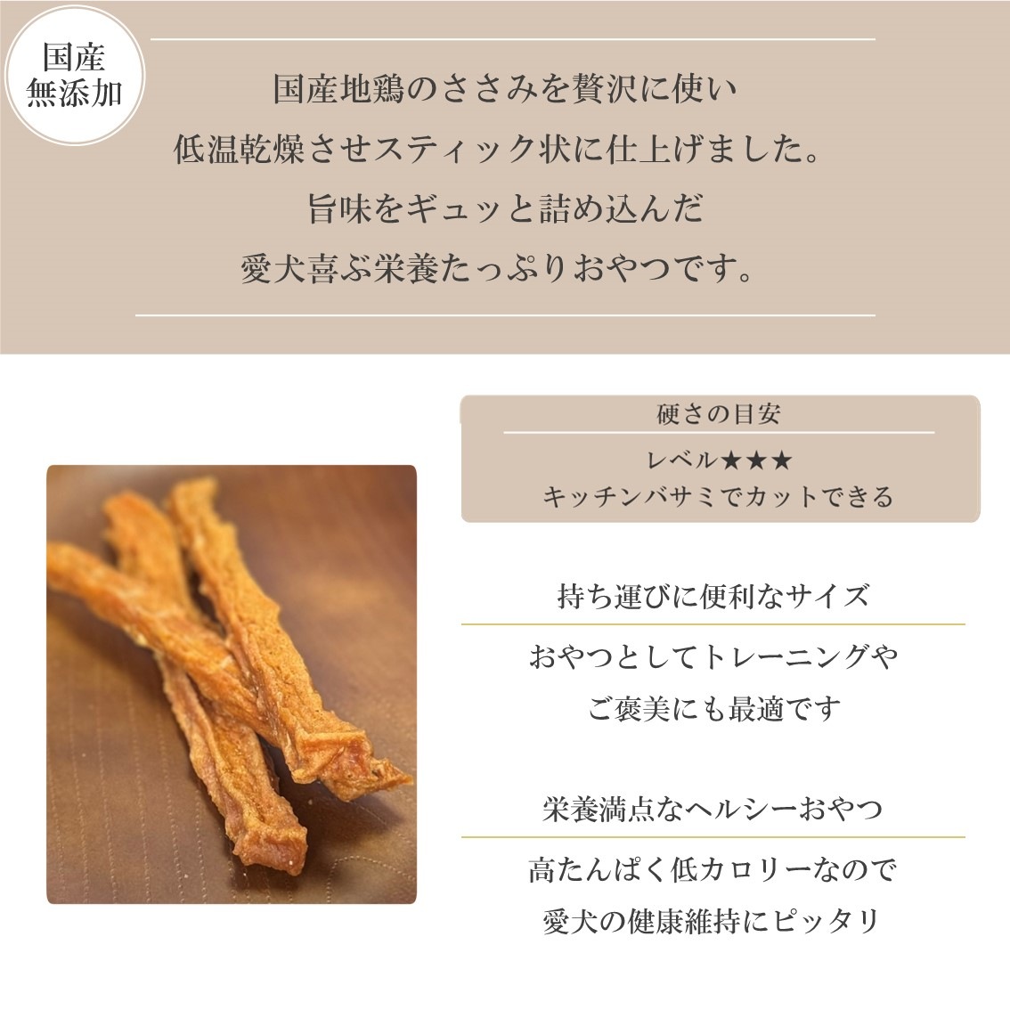 国産地鶏のささみを贅沢に使い、低温乾燥させスティック状に仕上げました。 旨味をギュッと詰め込んだ愛犬喜ぶ栄養たっぷりおやつです。 |