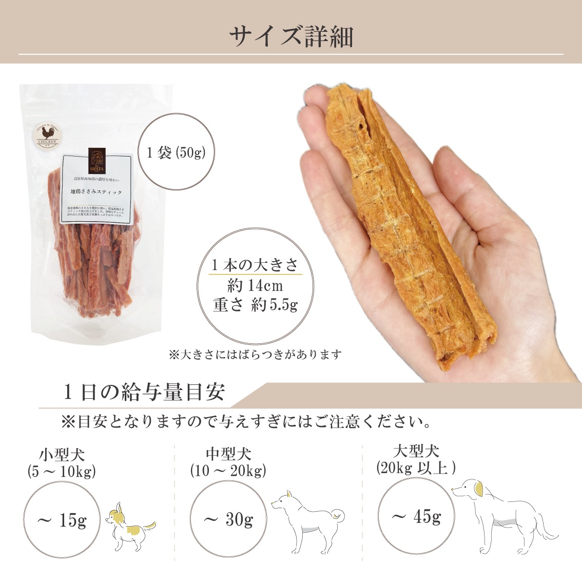 小型犬5~10kg :約~15g 中型犬10~20kg :約~30g 大型犬20kg以上 :約~45g 猫 2kg~5kg :約~10g 猫 5kg~ :約~15g |