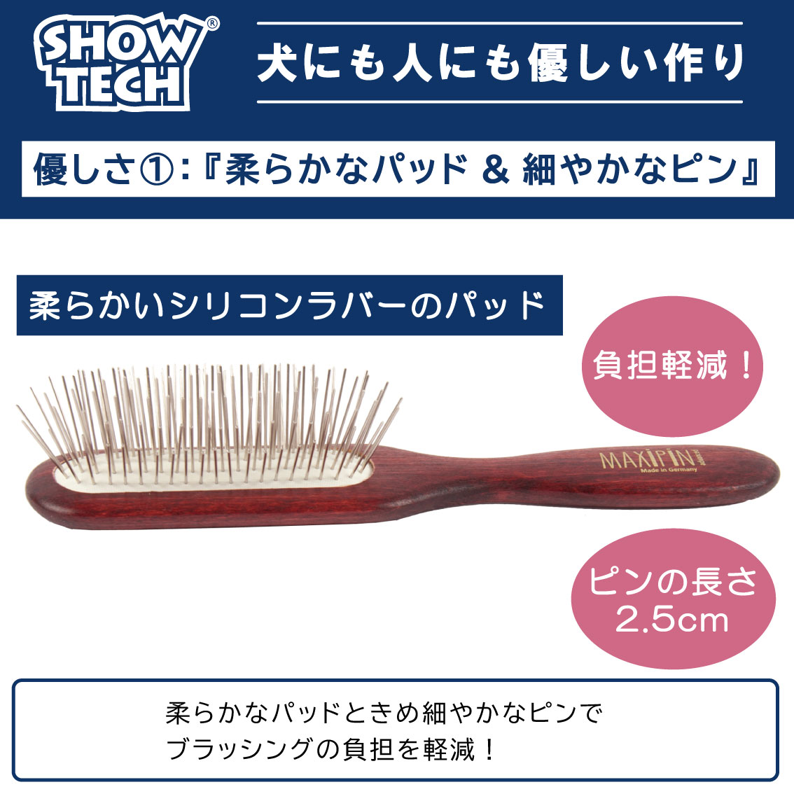 ●柔らかいシリコンラバーパッドときめ細かなピンがブラッシングによる疲労を軽減します。