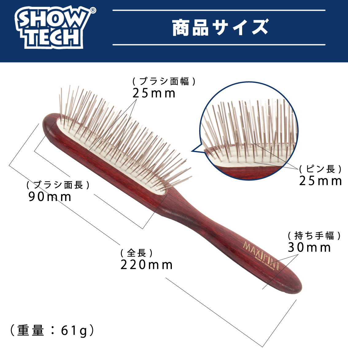 ◆本体サイズ:ブラシ面 90×25mm、ピン 24mm、全長 220mm