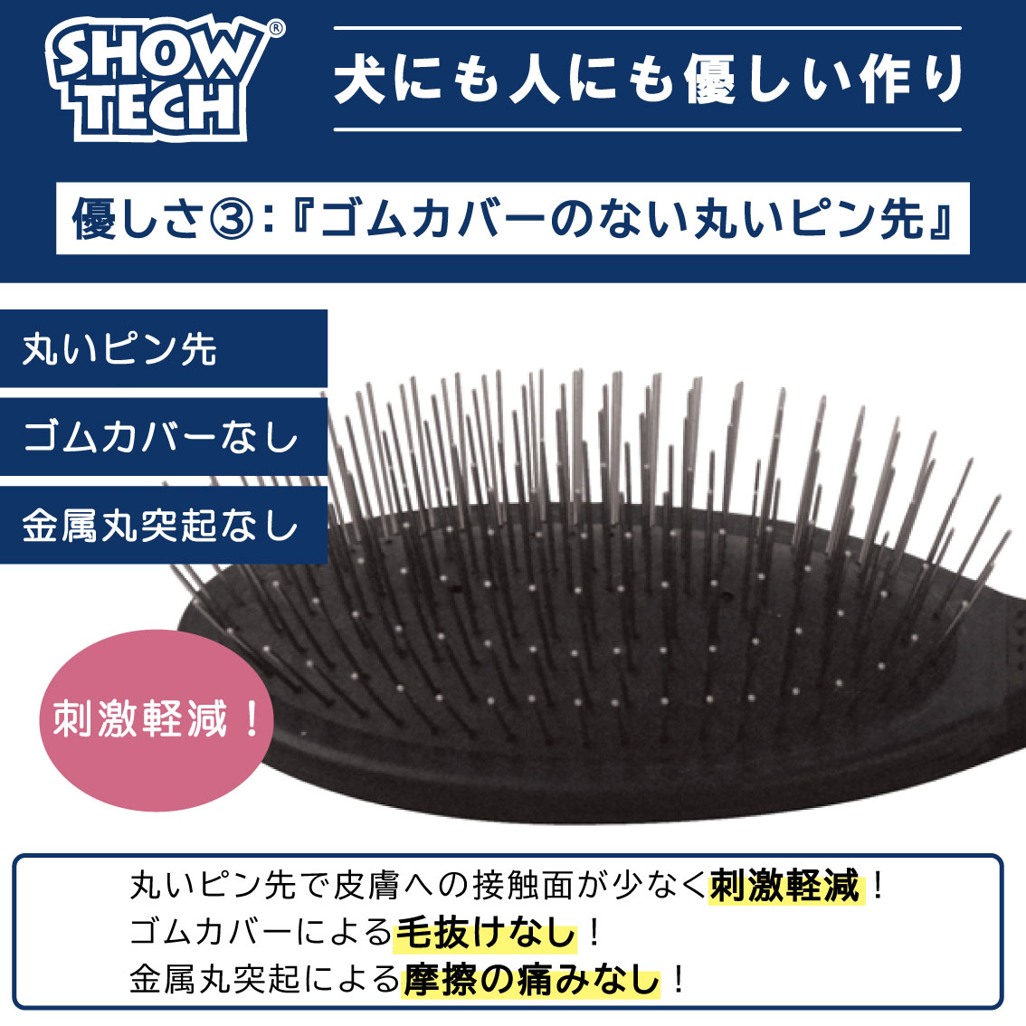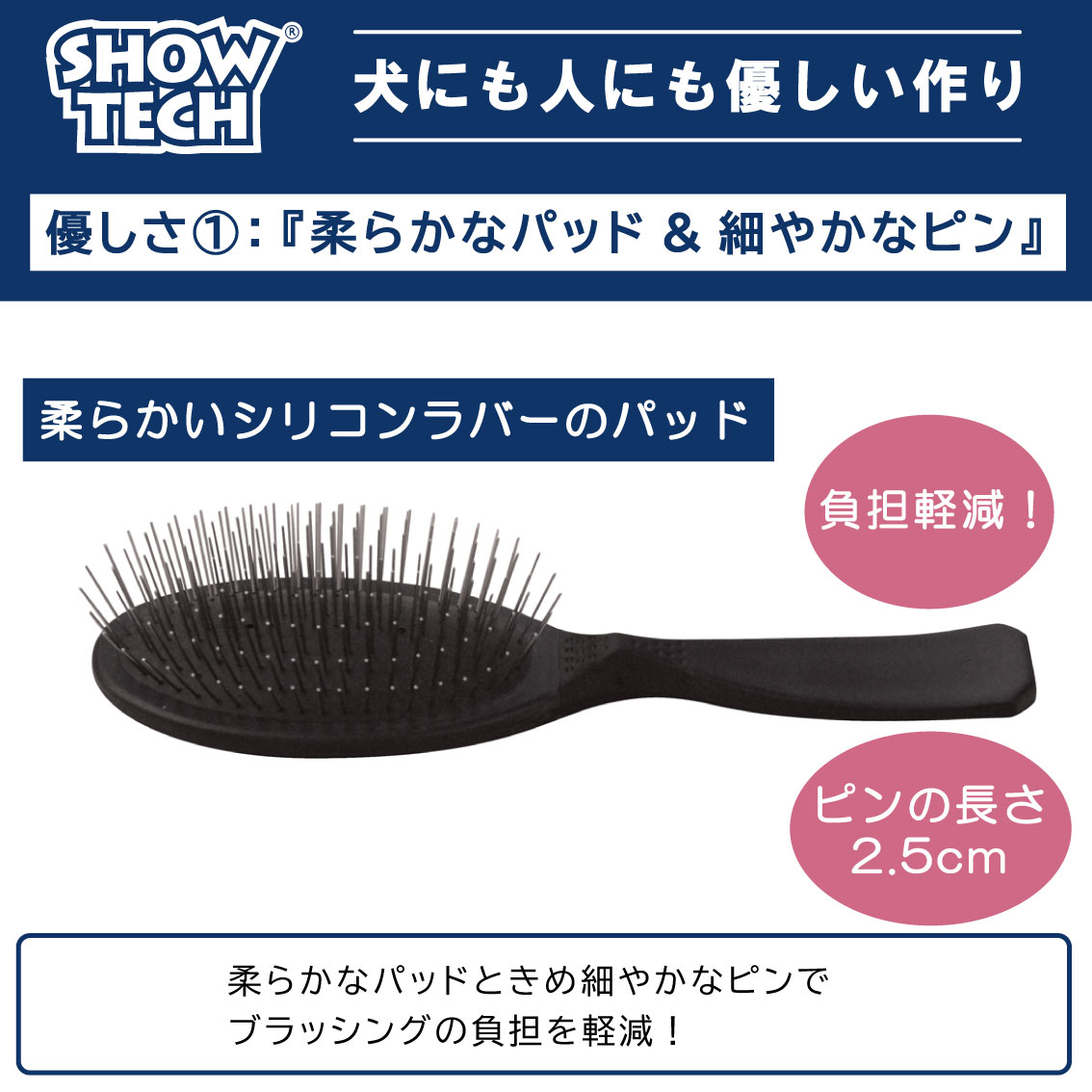 ●柔らかいシリコンラバーパッドときめ細かなピンがブラッシングによる疲労を軽減します。
