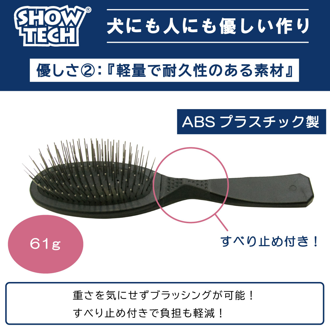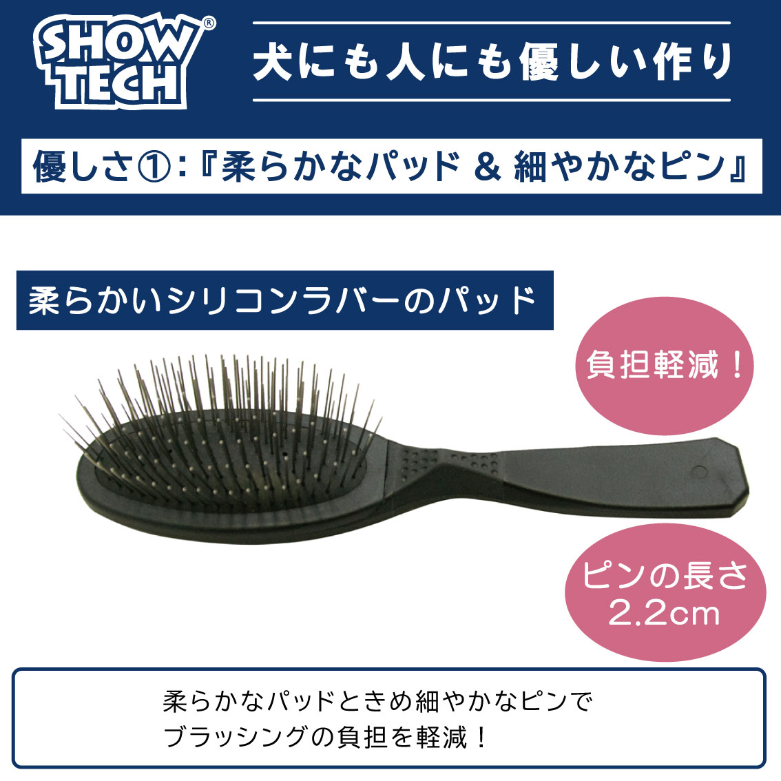 ●柔らかいシリコンラバーパッドときめ細かなピンがブラッシングによる疲労を軽減します。