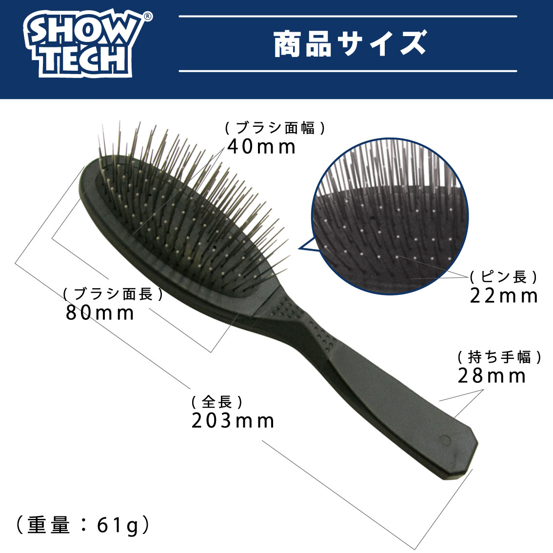 ◆本体サイズ:ブラシ面 80×40mm、ピン 22mm、全長 203mm