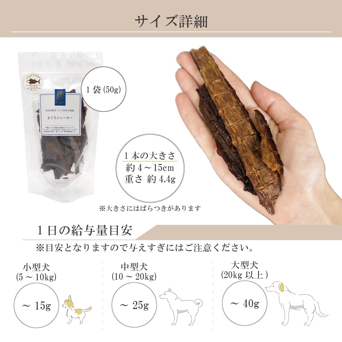 小型犬5~10kg :約~15g 中型犬10~20kg :約~25g 大型犬20kg以上 :約~40g 猫 2kg~5kg :約~10g 猫 5kg~ :約~15g |