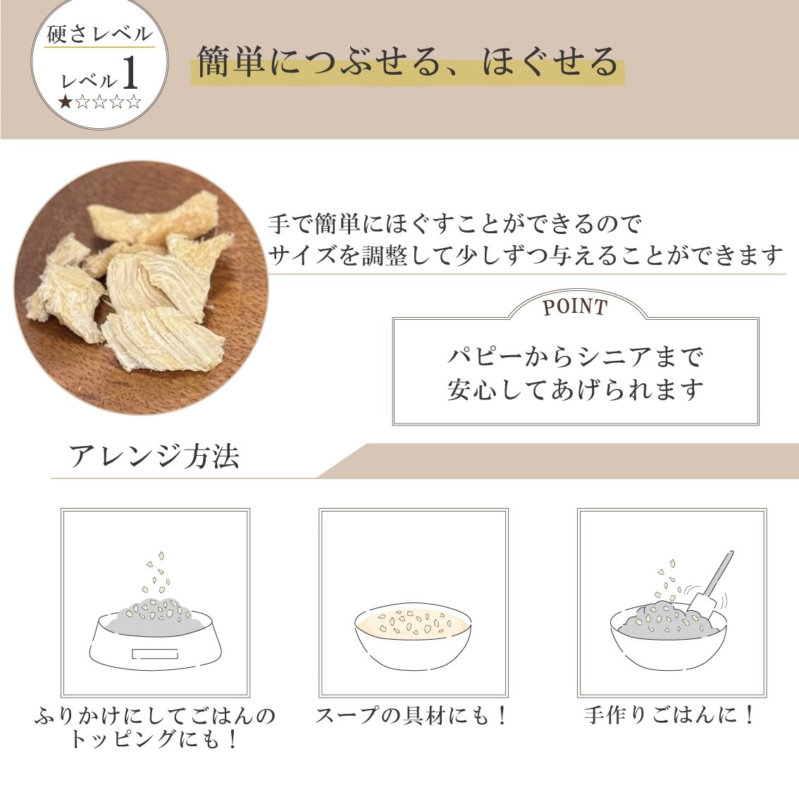 サクサク食感の鶏むね肉を、ひとくちサイズに。 そのままはもちろん、ぬるま湯で戻すとお肉本来の旨味や香りがより引き立ちます。 |