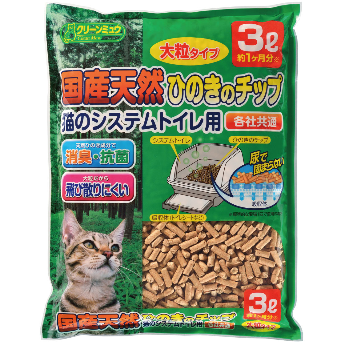 8袋セット 猫砂 ネコ砂 チップ 大粒 クリーンミュウ 木製 システムトイレ用 すのこ付きトイレ用 国産天然ひのきのチップ 3.0L CS21821 FREEBIRD フリーバード