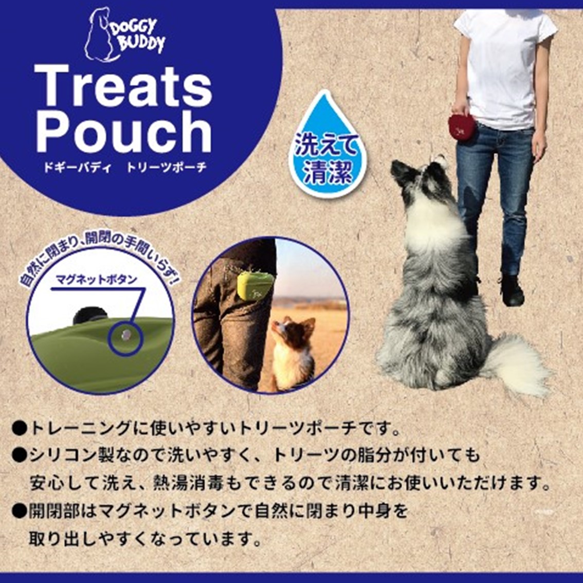 【検索語句】犬 散歩 おやつ入れ ポーチ トレーニング しつけ 洗える シリコン マグネット ドギーバディ トリーツポーチ グリーン ベージュ ブラウン ネイビー FREEBIRD フリーバード