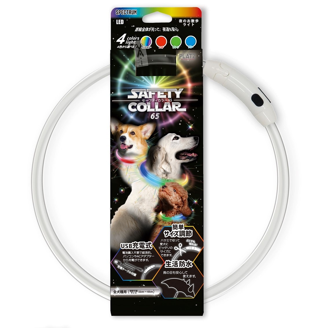 新商品! 犬 光る 首輪 ライト 虹色 レインボー 散歩 充電式 USB充電 生活防水 おすすめ おしゃれ 夜 明るい プラッツ PLATZ セーフティーカラー 65 スペクトラム FREEBIRD フリーバード