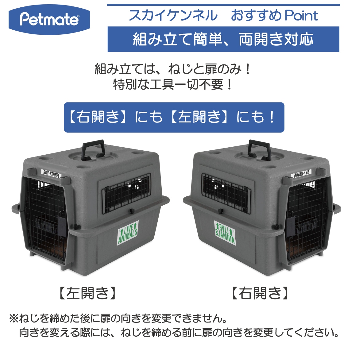 Petmate スカイケンネルシリーズは、丈夫なプラスチック製のペットクレートです。 お出かけ時の移動用キャリーとしてはもちろん、飛行機に乗る際の輸送用としても最適です。 また、お留守番時だけでなく、災害時の避難用ハウスとしてもお使い頂けます。 扉に取り付け可能なフードカップがついています。 |
