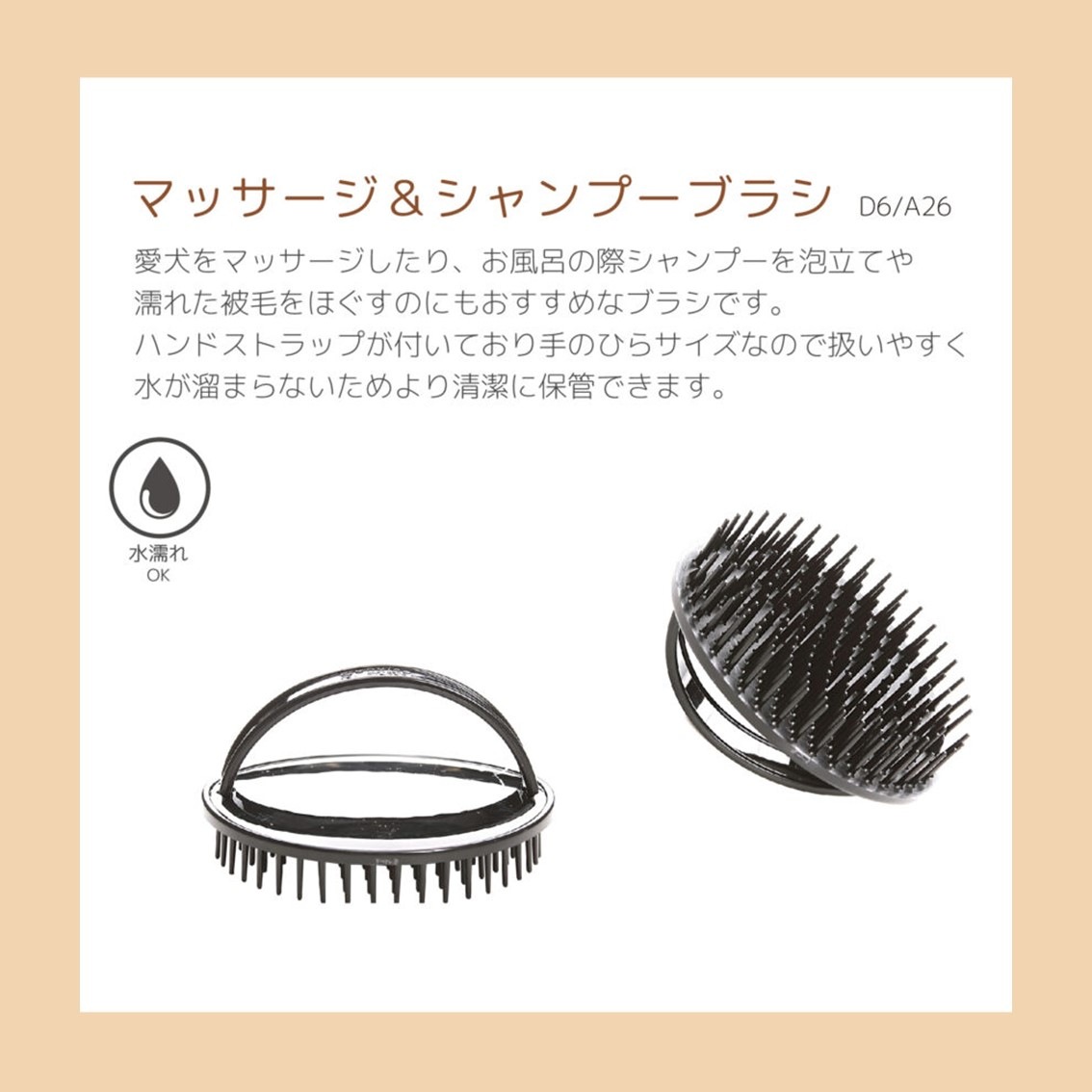 | 商品説明 | 愛犬をマッサージしたり、お風呂の際シャンプーを泡立てや濡れた被毛をほぐすのにもおすすめなブラシです。 ハンドストラップが付いており手のひらサイズなので扱いやすく水が溜まらないためより清潔に保管できます。 |